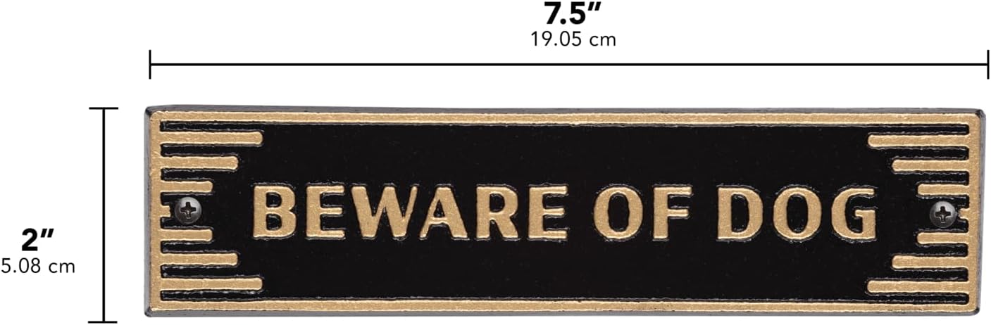 Art Deco “Beware of Dog” Sign – Cast Aluminum Door Plaque, Gold on Black, 7.5" x 2", Durable Weather-Resistant Metal Security Sign, Made in USA