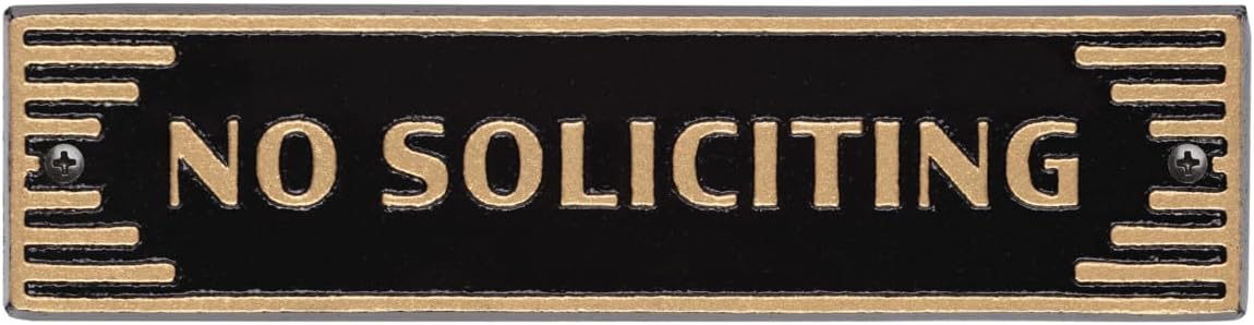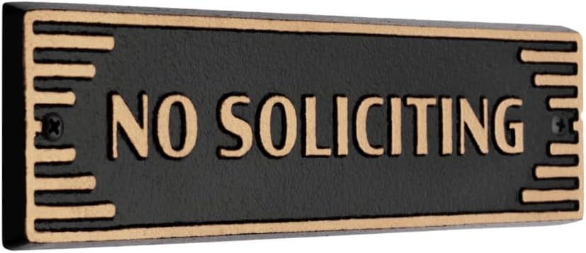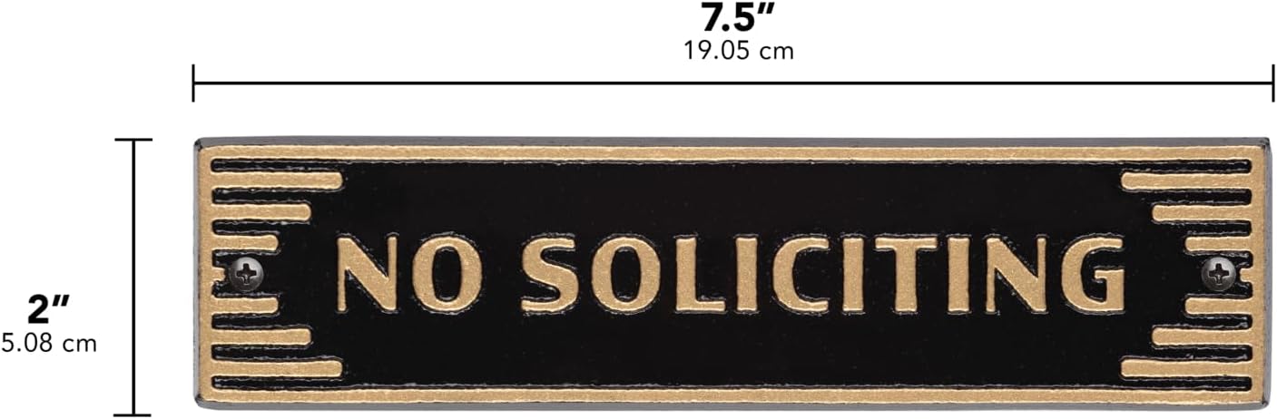 Bring style and clarity to your entryway with the Whitehall Products Art Deco “No Soliciting” Plaque. Measuring 7.5" x 2" and ⅜" thick, this compact yet striking sign delivers a clear message with a touch of elegance. Crafted from cast aluminum, it resists rust, corrosion, and fading for long-term outdoor or indoor use. The Art Deco design blends geometric sophistication with vintage charm, while the gold lettering on a black background ensures maximum visibility. Each plaque arrives ready to install with pre-drilled holes, making it easy to add both style and practicality to your home, business, or office entrance. Made in the USA, this durable metal sign offers a lasting way to protect your privacy with timeless design appeal.