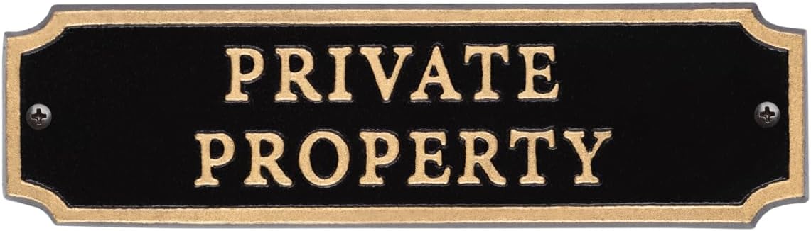 Add a refined touch of security and sophistication to your property with the Whitehall Products Cut Corner “Private Property” Plaque. Featuring a classic Art Deco-inspired design, this elegant sign blends vintage charm with modern functionality. Each plaque is precision-cast from high-quality aluminum and finished with a durable powder coat that resists rust, fading, and wear in any weather. The bold gold lettering against a deep black background ensures your message is seen clearly, while pre-drilled holes make installation quick and simple on any flat surface. Perfect for residential or commercial use, this plaque combines beauty, durability, and practicality—all proudly made in the USA.