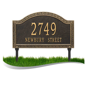 Personalization is easy! After your purchase our Friendly, U.S. based representatives will send you a design layout for your approval. Give home an affordable makeover. These plaques combine popular architectural styling with large numbers for maximum visibility. Made from durable aluminum with an all-weather powder coated finish. It is totally rust free. This plaque is easy to order and fast turnaround for this distinctive cast aluminum personalized house numbers plaque. This plaque is made in the USA. Ships within 2 weeks after your approval. Your address will be ground shipped to you (usually through UPS) Choose from 7 different super durable all weather powder coat color.